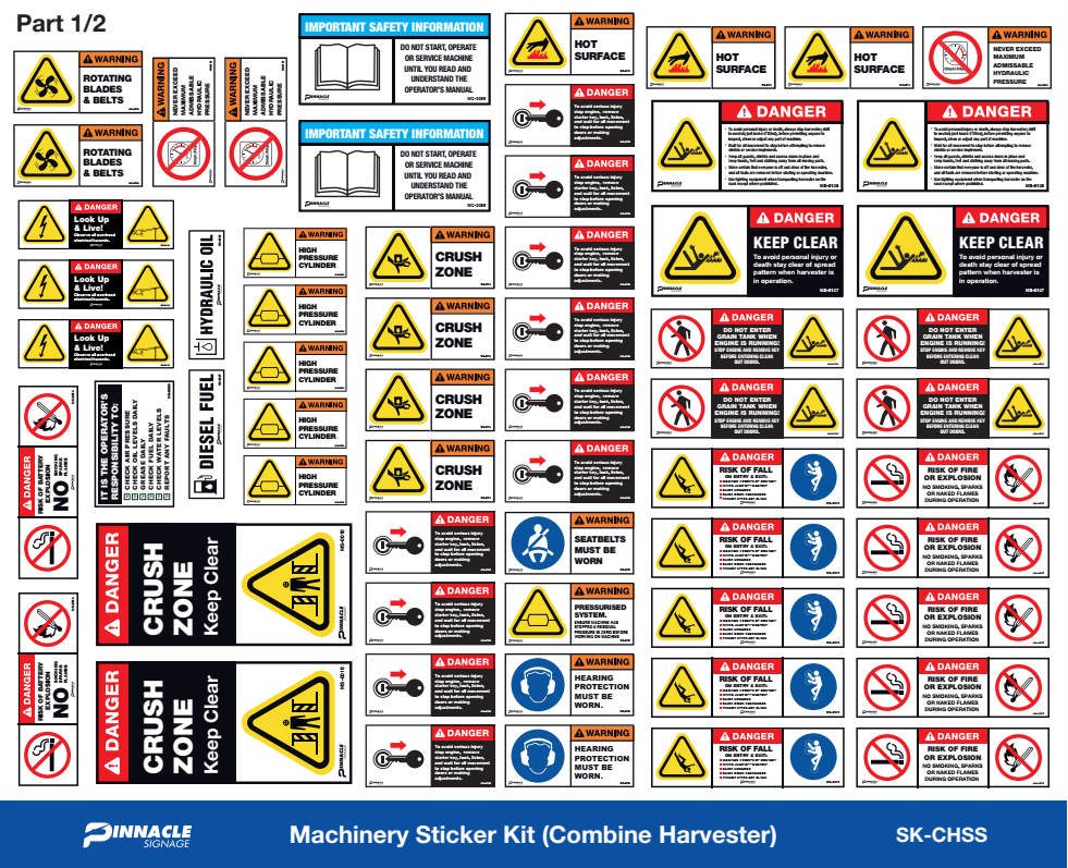 Label your combine harvester/header with our comprehensive sticker kit for enhanced safety and compliance. Order now for reliable, high-visibility signage